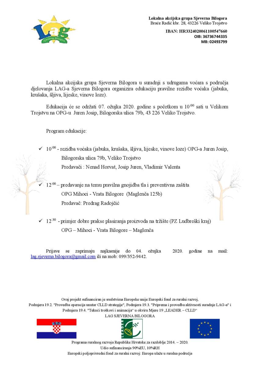 Poštovani, Lokalna akcijska grupa Sjeverna Bilogora u suradnji s udrugama voćara organizira edukaciju pravilne rezidbe voćaka (jabuka, krušaka, šljiva, lijeske, vinove loze). Edukacija će se održati 07. ožujka 2020. godine s početkom u 10:00 sati u Velikom Trojstvu na OPG-u Juren Josip, Bilogorska ulica 79b, 43 226 Veliko Trojstvo. Prijaviti se možete putem e-maila: lag.sjeverna.bilogora@gmail.com ili na mob: 099/325-9442