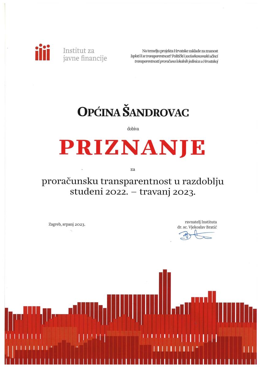 Općina Šandrovac osvojila je priznanje za proračunsku transparentnost za razdoblje studeni 2022.- travanj 2023. godine sa maksimalnim brojem bodova.