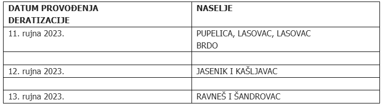 Deratizacija će svakog navedenog dana započeti u 9,00 sati, a u slučaju lošeg vremena