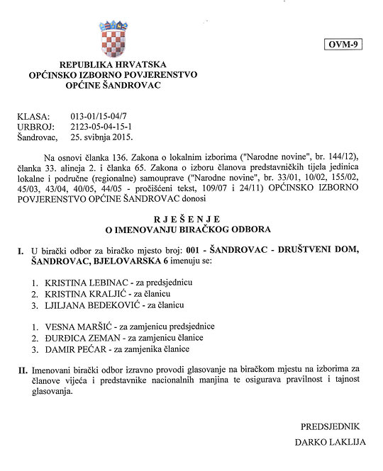 Oglas o biračkom mjestu za izbor predstavnika srpske nacionalne manjine u Općini Šandrovac i Općini Veliko Trojstvo